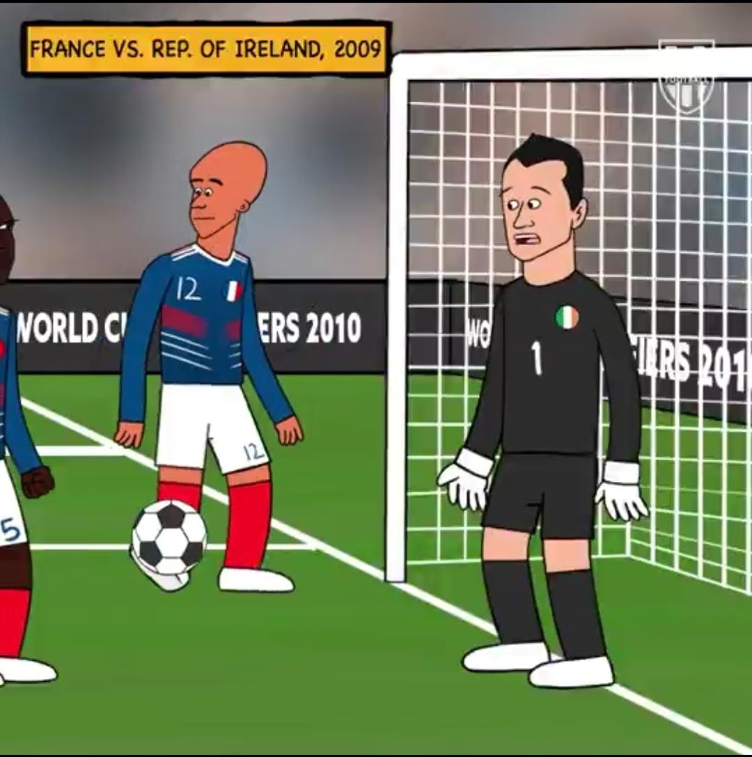 La famosa mano que clasificó a Francia al Mundial 2010 es detectada. En esta versión, Irlanda clasifica y vemos a los jugadores franceses viendo el mundial desde su sofá con una botella de champaña en la mano.